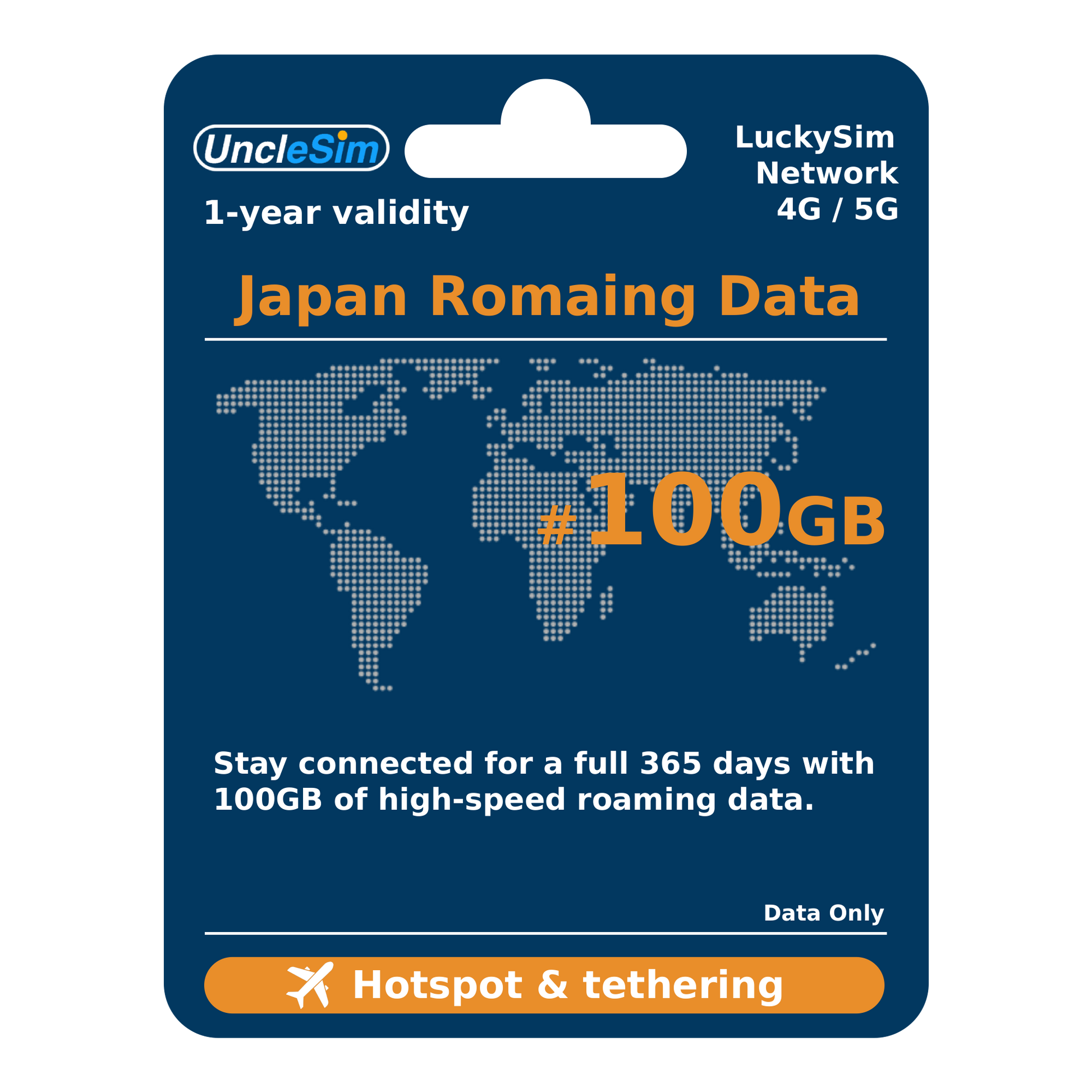此卡提供 365天有效期,包含 100GB 高速漫遊數據。